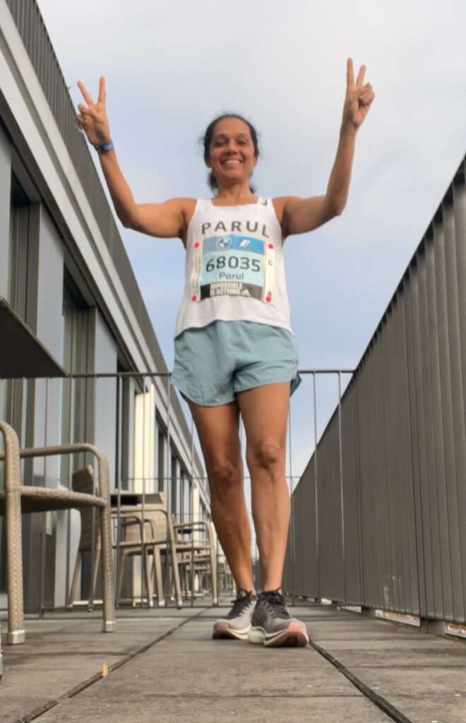 25km-30km: Still smiling and waving frantically at everyone, who cheered me on by calling out “Go Parool!”. By then we heard that Kipchoge had set a new World record. Wow wow wow- inspiration right there!